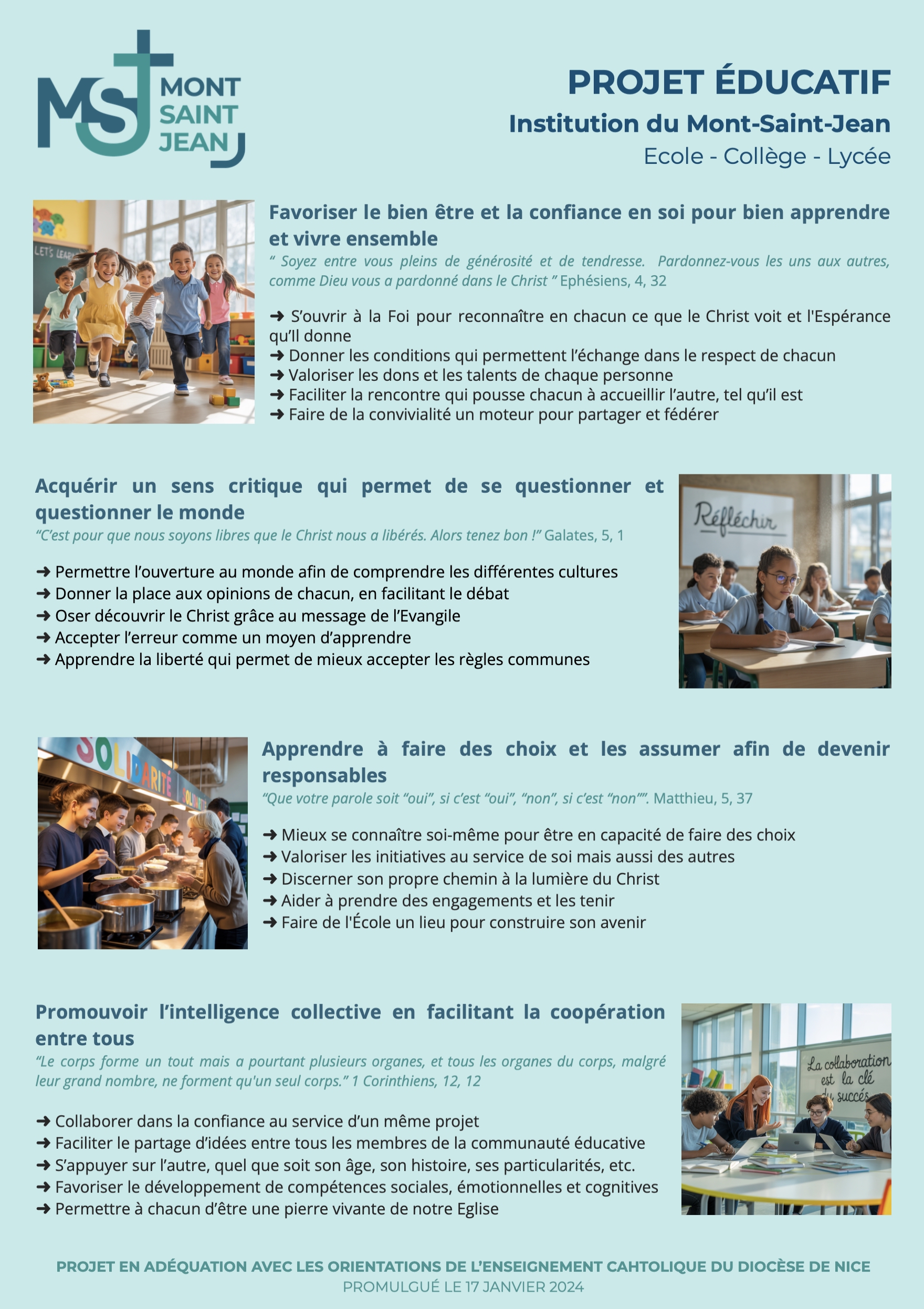 Le 17 janvier 2024, Monseigneur Jean-Philippe NAULT, évêque de Nice, a promulgué le nouveau projet éducatif du Mont-Saint-Jean.